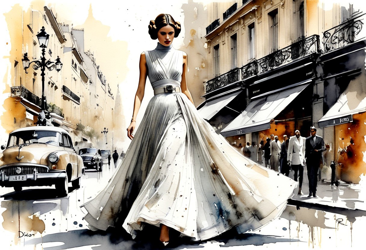 Christian Dior Princess Leia preliminary rough draft ink sketch watercolor wash on off white paper of elegant Haute Couture concept dress with classic Paris street background painting in the style of artists such as Russ Mills, Sakimichan, Vlop, Leush, Artgerm, Darek Zabrocki and Jean-Baptiste Monge,