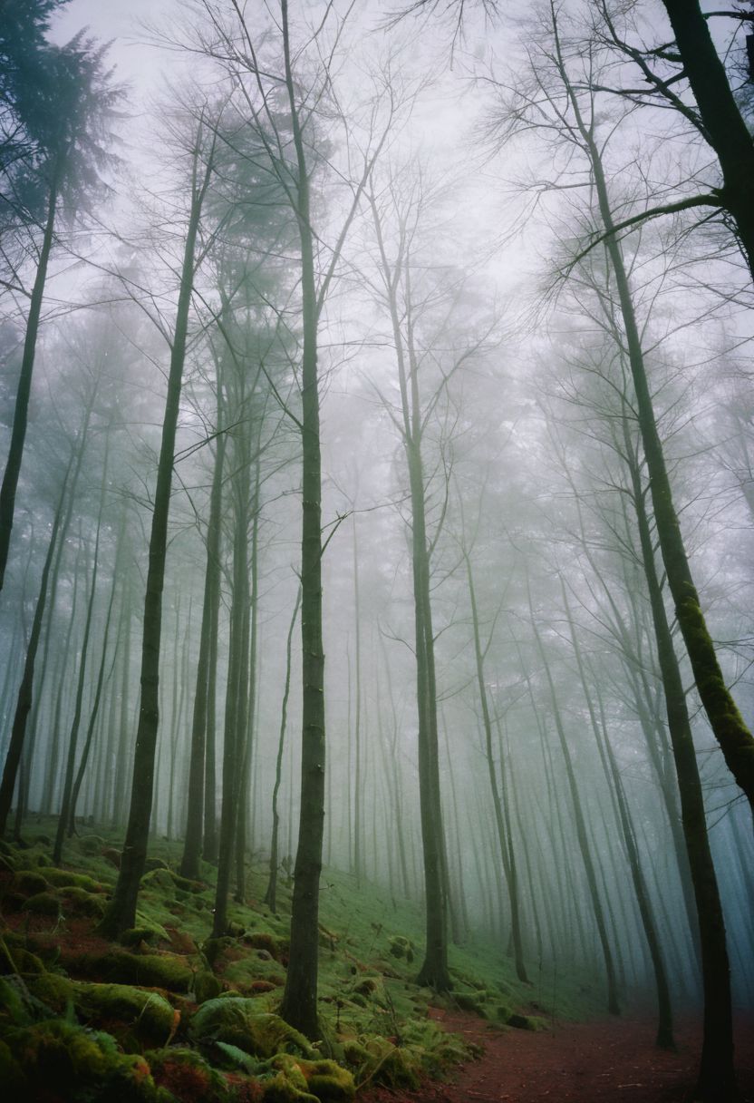 soaked_kaffee, instagramphoto, a foggy forrest somewhere in europe with some birds in the sky, soft shadows, filmgrain