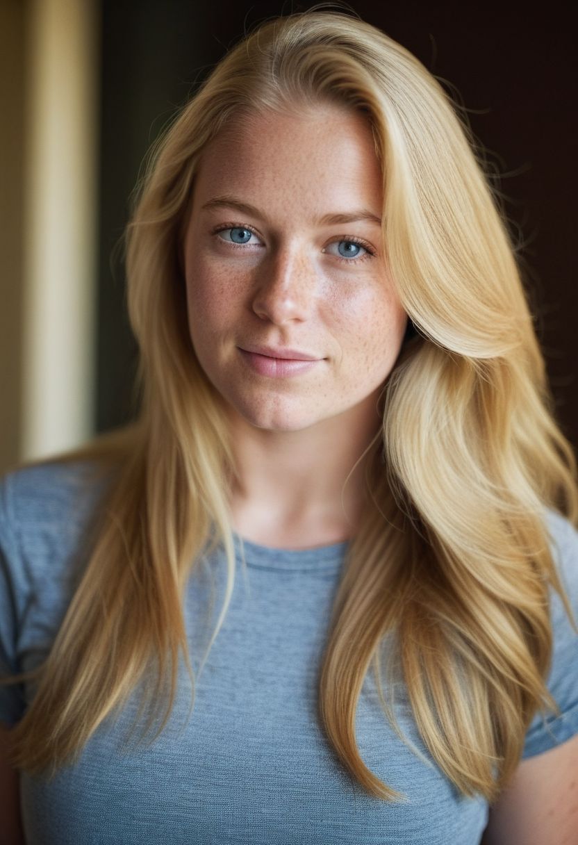 Beautiful woman, 25 years old. Blonde long hair, tall, (freckles:0.8), graceful, charming. (Wearing a t-shirt and jeans:0.5). (Full-body shot:1.1), soft warm light, (50mm:1), (f/2:0.7). Detailed face, detailed eyes, photograph.