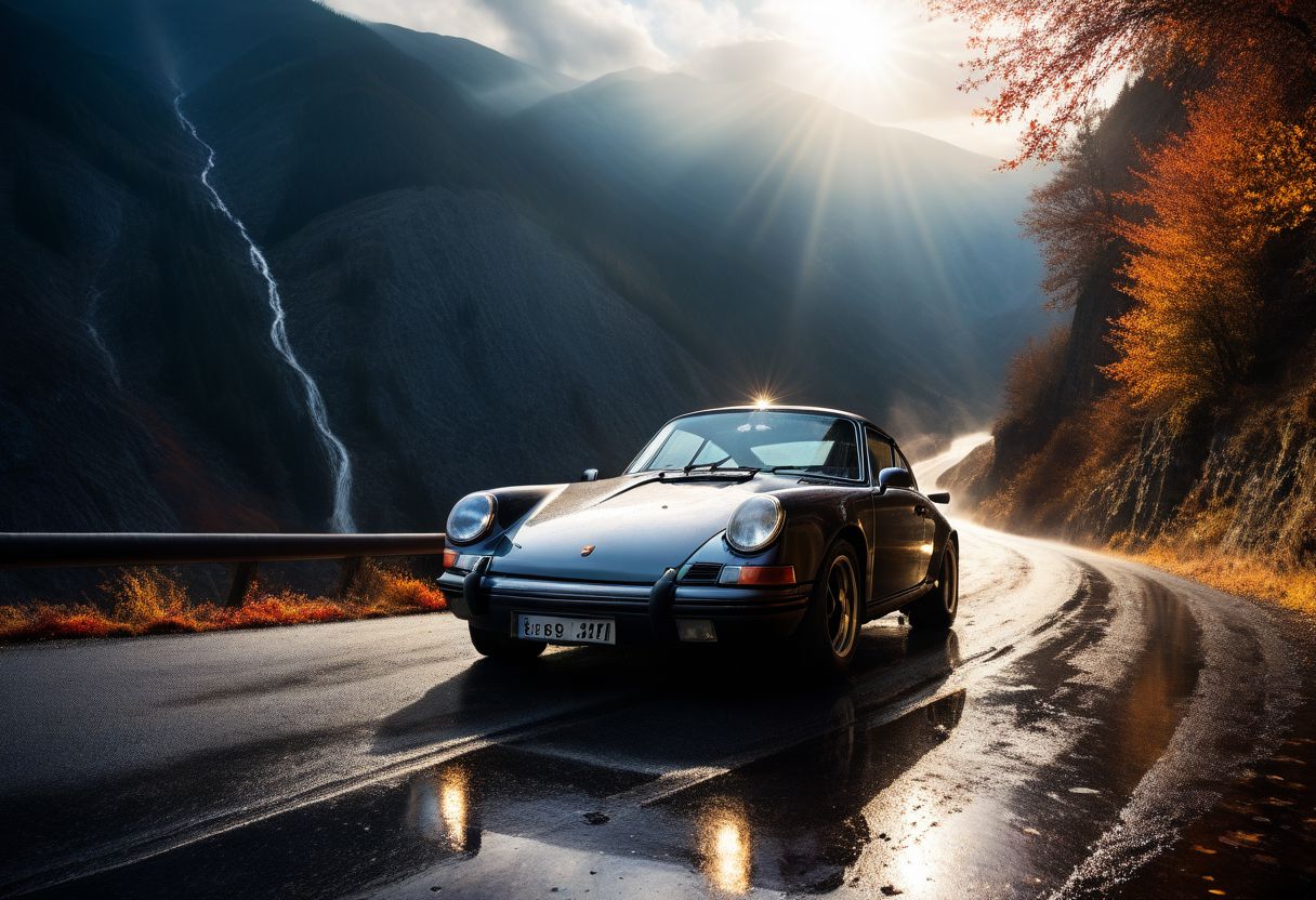 raw photo of a classic Porsche 911 on high mountain wet road, nebula, Need For Speed, Fast & Furious, sun rays, dramatic lighting, autumn leaves.