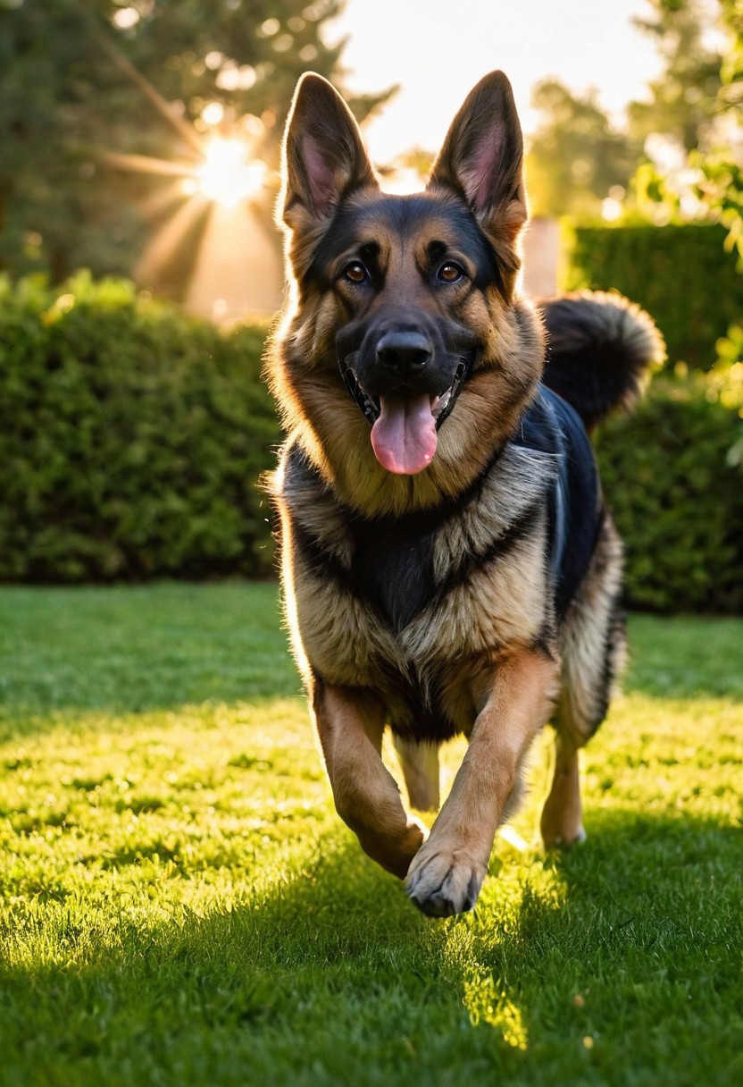 German shepherd dog, mid-tumble over a well-worn football, tongue lolling out in a wide grin, evening golden light casting elongated shadows, playful scene unfolding in a lush, green backyard, focus on gleeful expression, fur texture detailed, dynamic motion blur emphasizing playfulness, shallow depth of field with bokeh effect in background, sun flare, digital painting, vibrant color palette, high resolution.