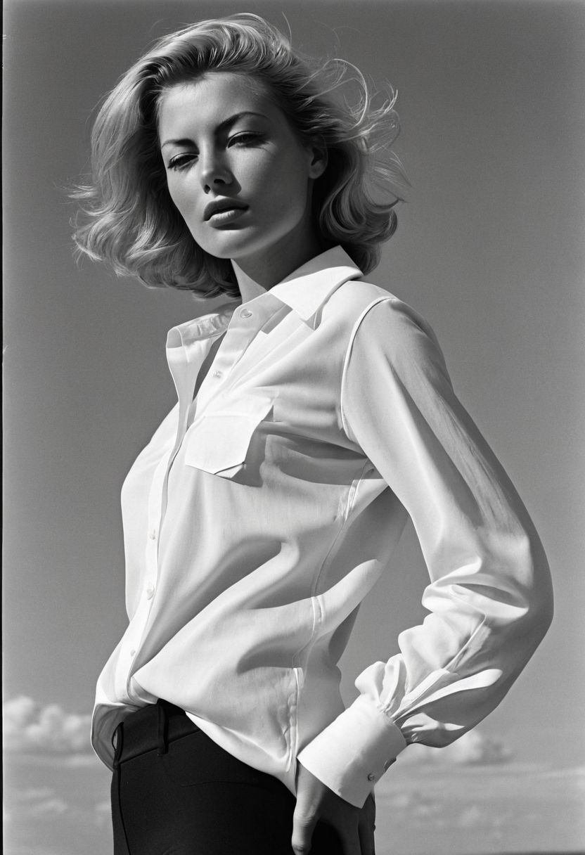 Stunning b&w 35mm full body photo of a beautiful (woman like [Ava Lavinia Gardner:russian girl:0.6]), Blunt Cut Haircut, {White|Dirty-Blonde|Platinum-Blonde} hair. perfecteyes, dark circles under eyes, highly detailed skin, (lightest freckles and (moles) all over body:0.9), flat chested. hips. intricate poses by ruth bernhard. (Photography and style by ruth bernhard). 35mm, Hasselblad. capturing fashion-forward visuals, creating visual impact,evoking emotion,pushing creative boundaries. (little_belly:0.9). standing in a casual pose with her hands on her hips. She is wearing, An (wide-open:1.4) button-down shirt to expose breasts with rolled-up sleeves and tight high-waisted black_spandex_leggings. nipslip. unbuttoned shirt. open shirt. golden hour, shot from the side, playful pose, god rays,artistic photoshoot, visible bumplled nipples