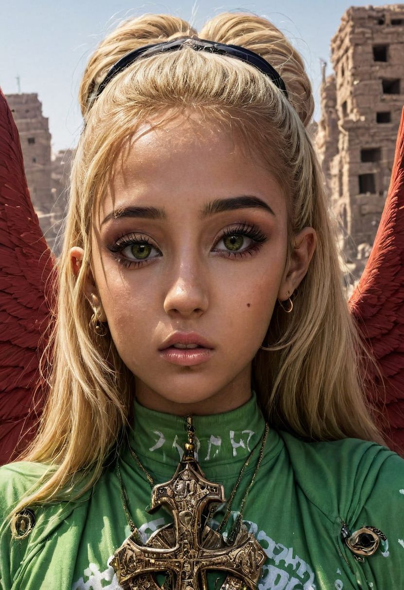 , solo of goodisis, goodnes ornate, egypt, ruins, energy, aura, dust, debris, Face looking, tanned skin, women, Ankh Cross, wings, ankh, Black Eyeliner Ariana Grande-Butera cyber punk blond Ariana Grand-Butera red army thin transparent wet green cloth