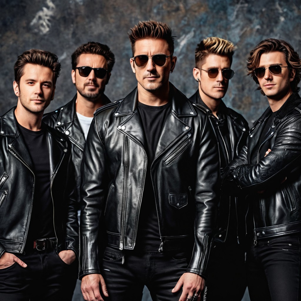 instagram photo, rock band four mans, 8k,high Good quality photo,The four men are wearing leather jackets,very Handsome mans