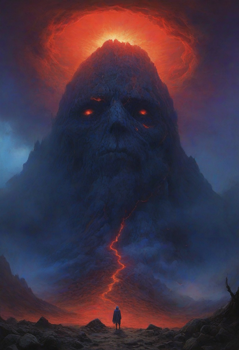 landscape, volcano, ash, gray stone, ghoul, halo, digital artwork by Beksinski, 18 years old, vibrant colors, blue theme, red theme, purple theme, storm, eruption