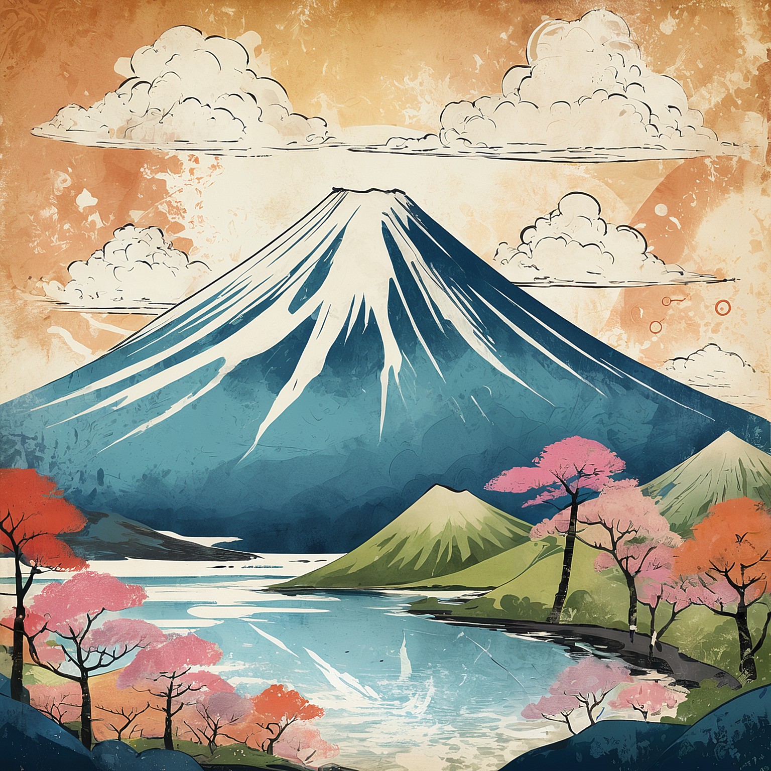 Mount Fuji, whimsical fantasy story book illustration on rough paper, vintage poster style with expressive brush strokes