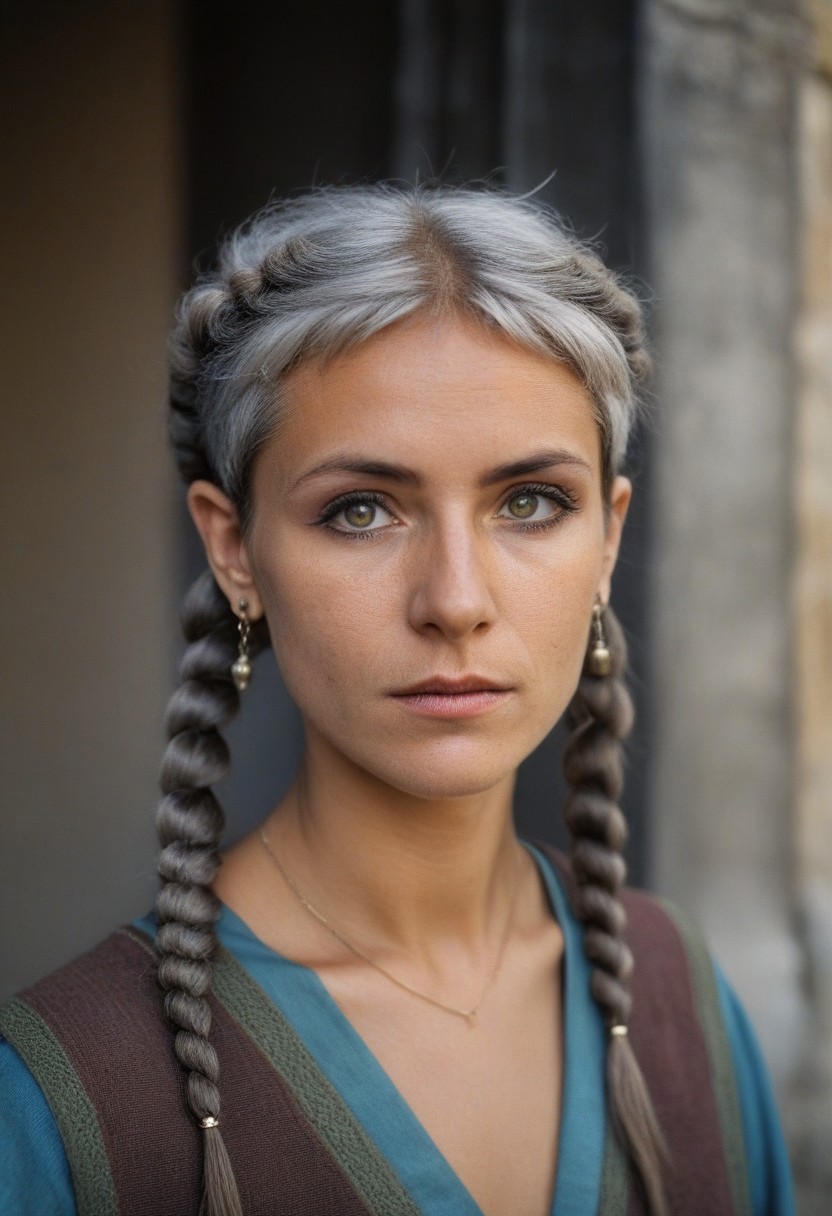 Photography in (stvmccrr style), analog film, film grain, kodachrome, natural lighting, 8k, hdr, masterpiece, award winning photography, (frieren, pointy ears, elf, earrings, twintails, parted bangs, grey hair, thick eyebrows), ancient roman street corner