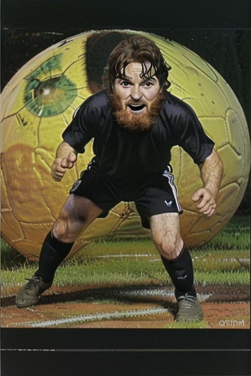 Weirdcore captaintsubasa <ffurian> male man 1boy is kicking, shot, best quality, soccer player, detailed face, happy emotions, 90VHS, (ffurian man with beard 1.4) ms paint style, half0ster, style of Richard Corben
