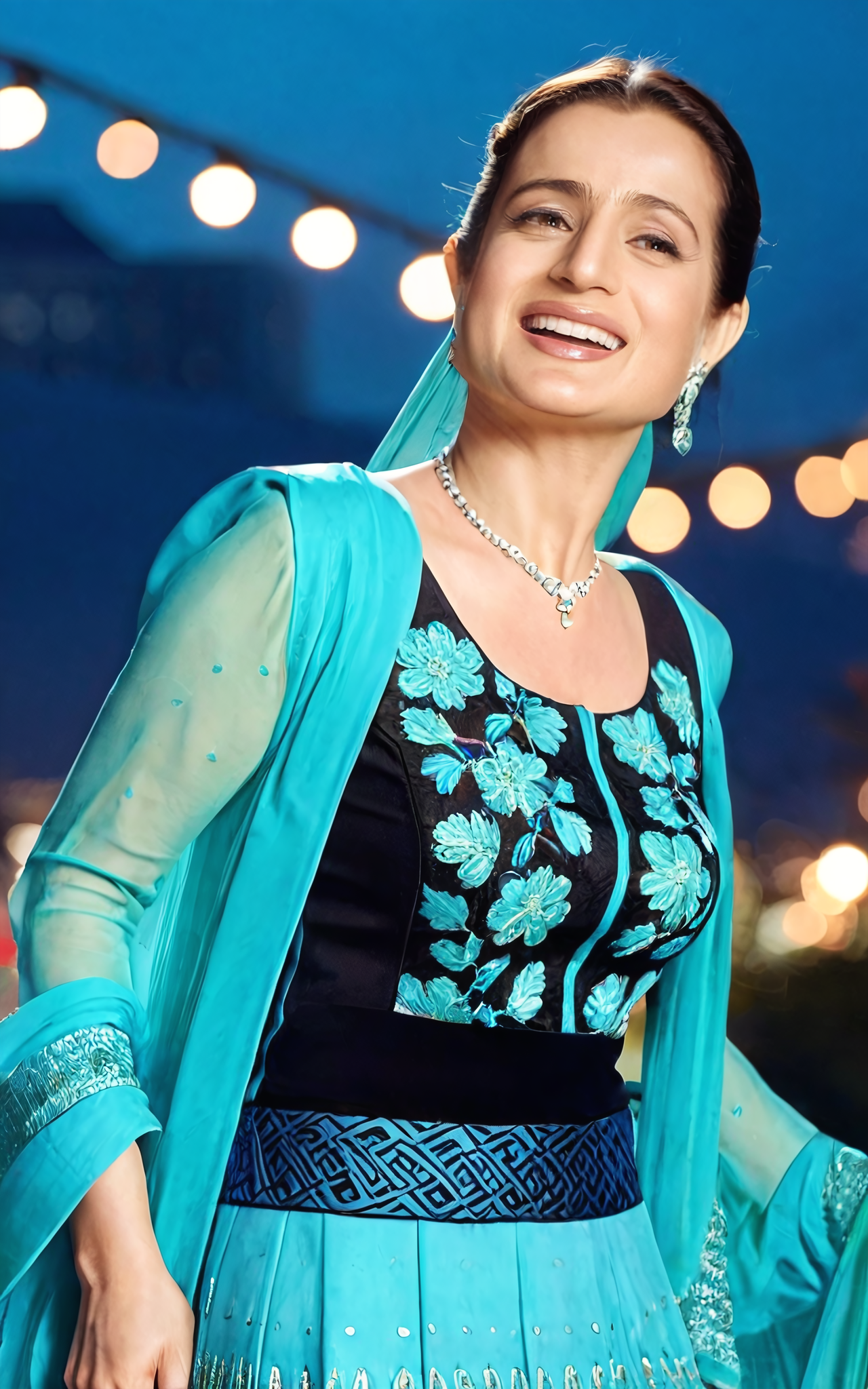 full body photo of ameesha patel woman, solo, , laughing, looking at the camera, Cyan ethnic clothing, night time, contrasting background bokeh <lora:Ameesha_Patel_SDXL_LoRA_prodigy_local_xformers:1>