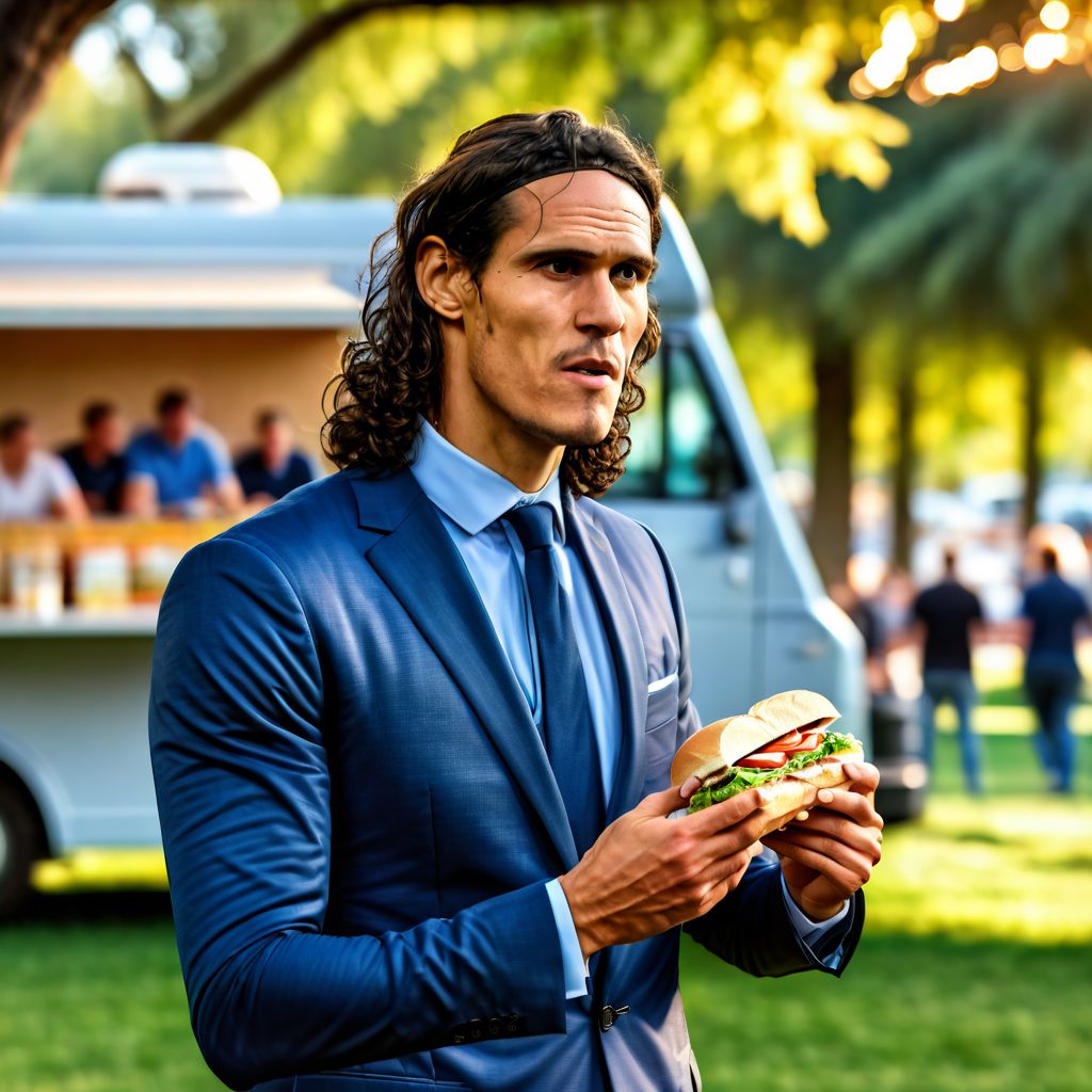(cavani ultra realistic photo) of a man wearing a suit, (eating a sandwich:1.3), (looking at the viewer:1.1), (standing), (next to a detailed food truck), (in a park full of trees, with detailed people practicing sports, and kids playing), (soft natural lighting, shadows, high resolution, detailed textures), (4k, high resolution, detailed, sharp focus), sun is shining, (best quality), (detailed), (8k), (HDR), (cinematic lighting), (sharp focus), (intricate)