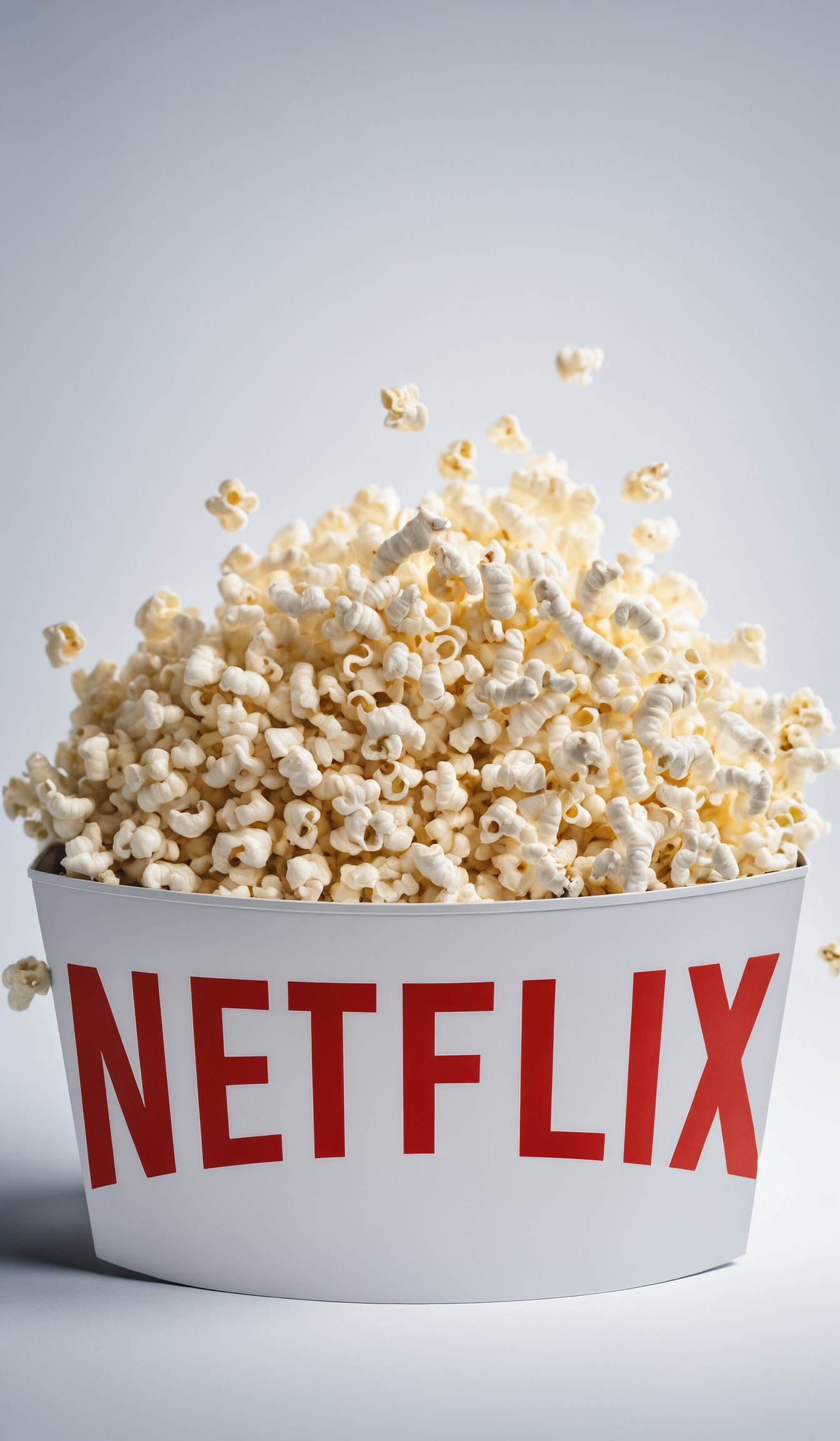 Popcorn, Netflix logo, film, cinematic look, focus stacking, dslr, white space on top