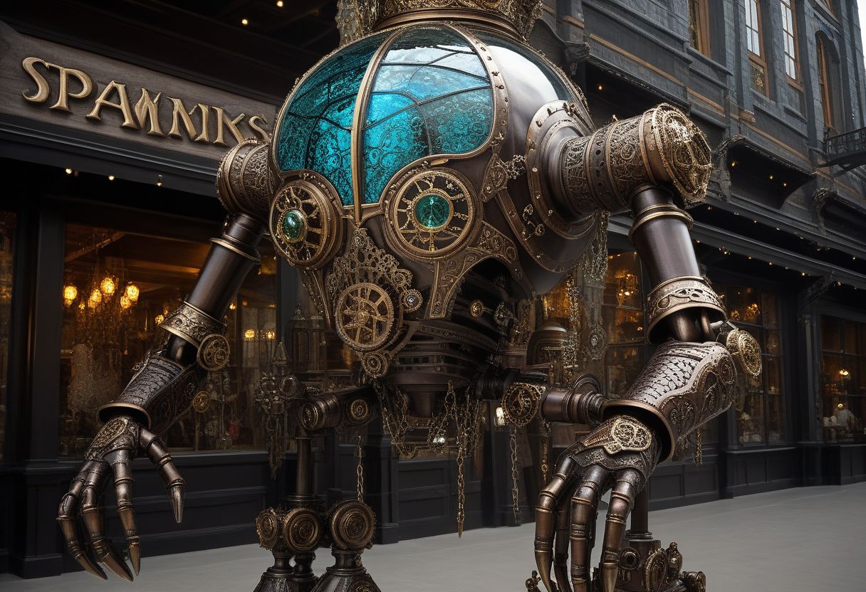 steampunk giant colored glass carriage headed large legged robot, lace glass robot head inside of a steampunk fantasy town, large detailed torso, one forty foot tall steampunk robot with great arms and two heavy legs on flat feet, photo realistic image, steampunk details, cogs, chains and pipes incorporated in the industrial buildings. wizards, day,