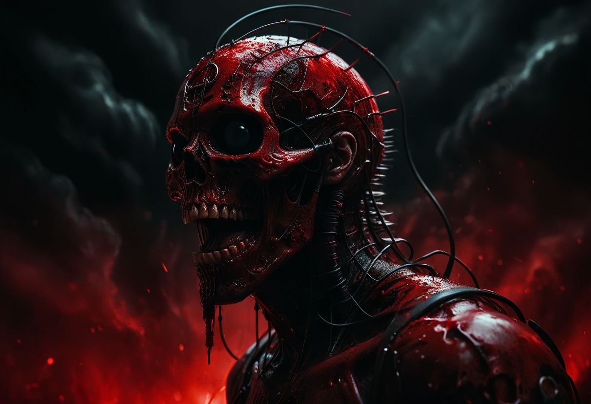 ((Looking back over shoulder)),slimey drool,tiny pupils,minimal, clean wire install, apocalypsecore virus, black plague intrigue, the last smile in red oil paint Wide range of colors., Dramatic,Dynamic,Cinematic,Sharp details Insane quality. Insane resolution. Insane details. Masterpiece. 32k resolution