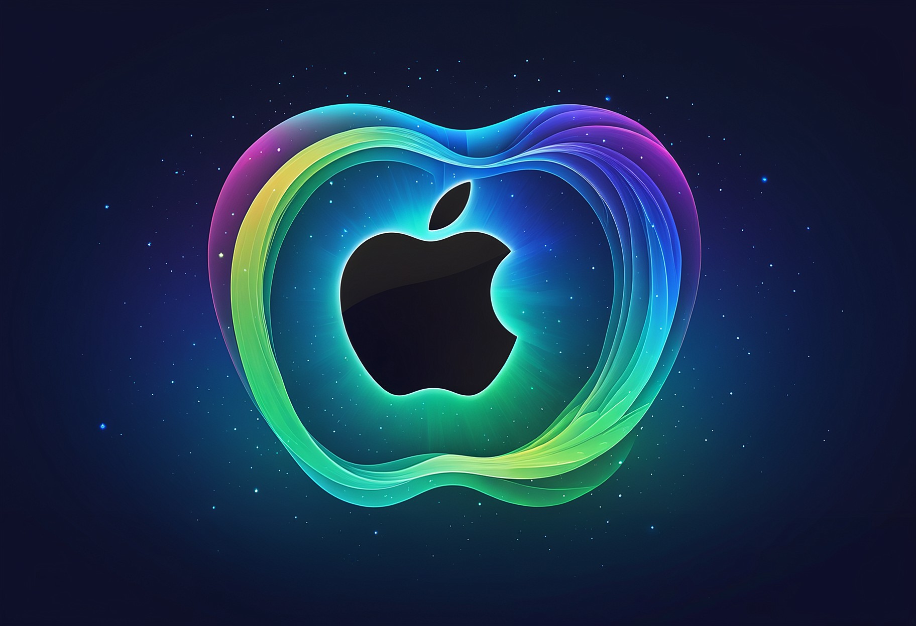 Apple logo in aurora borealis style, made of vibrant northern lights, against a pure dark blue background