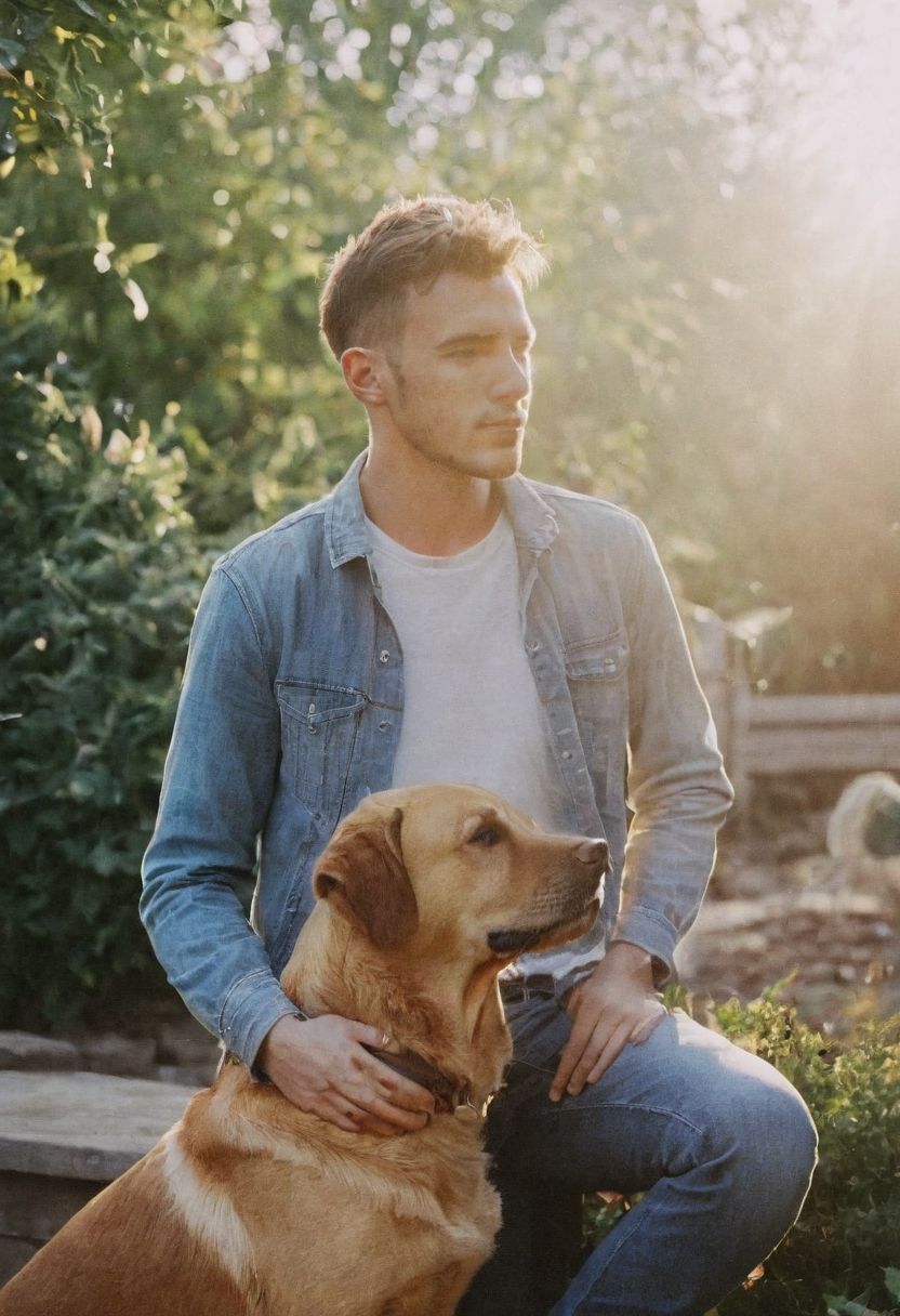 cinematic film still fashion photography portrait of 1man with dog as companion, grainy, headshot, sunlight , Fine Art & Beauty Photography – ,,light diffraction in frame, dreamy,hazy look. Helios 44-2 lens mounted on a Praktica MTL 5B Helios 44M-4 lens, 58mm f/2, in a garden.