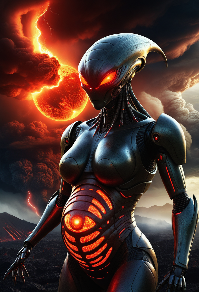 score_9, score_8_up, score_7_up, score_6_up, score_5_up, score_4_up score_9,score_8_up, digital art, (pregnant:1.5), alien looking slimy belly, robot, inhuman, android, scary, menacing look, angry, threatening, dangerous, evil, demonic, red glowing eyes, realistic 3D illustration, soft lighting, contemplative expression, high-resolution, detailed texture, emotional depth, dramatic mood, dangerous atmosphere, cinematic lighting, side view, volcanic alien planet, large tornado, fire, dark clouds, lightning, smoke clowds, volcanoe eruptions