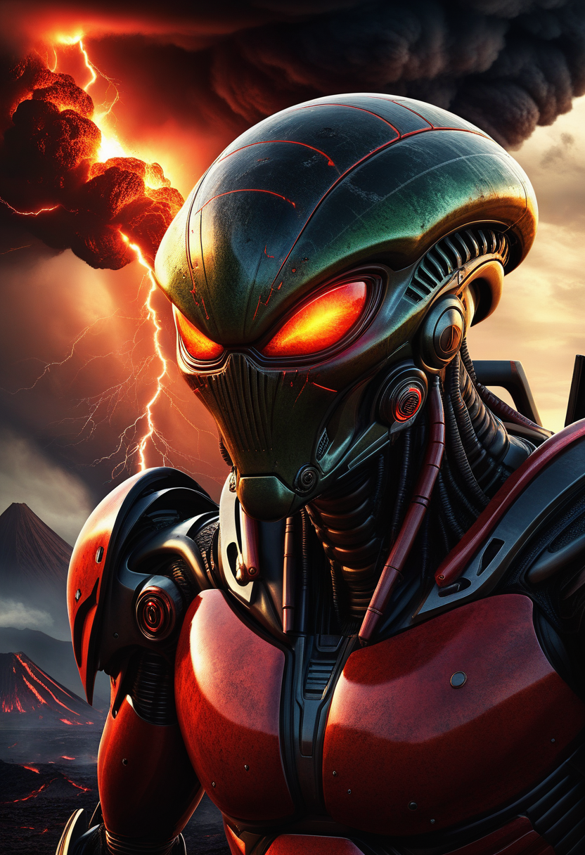 score_9, score_8_up, score_7_up, score_6_up, score_5_up, score_4_up score_9,score_8_up, digital art, alien looking slimy belly, robot, inhuman, android, scary, menacing look, angry, threatening, dangerous, evil, demonic, red glowing eyes, realistic 3D illustration, soft lighting, contemplative expression, high-resolution, detailed texture, emotional depth, dramatic mood, dangerous atmosphere, cinematic lighting, side view, volcanic alien planet, large tornado, fire, dark clouds, lightning, smoke clowds, volcanoe eruptions, apocalypse