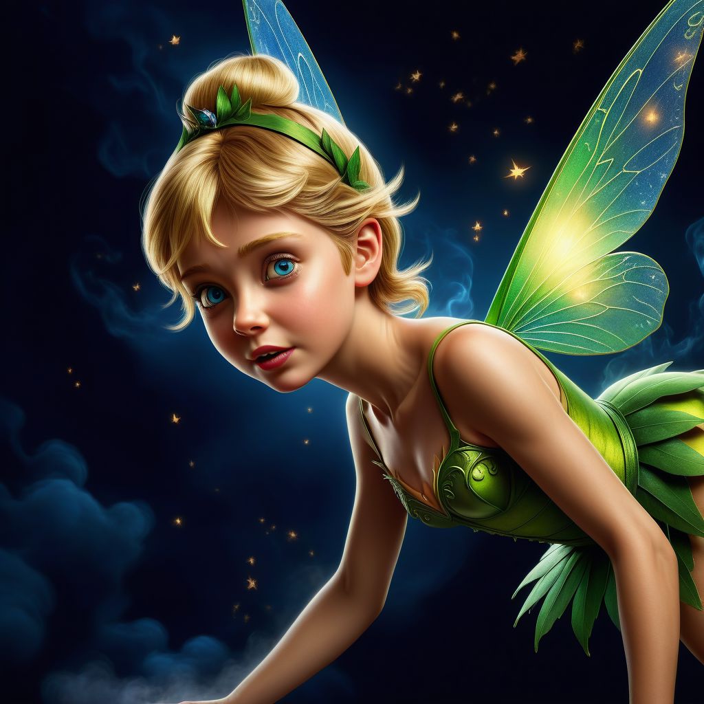 Ultra realistic color pencil image of Tinkerbell flying around the head of Peter Pan. BREAK Deep dark intense midnight blue smoky background, Dark theme, dynamic lighting, (soft shadows), (soft focus), (photo realistic), uhd, 8k