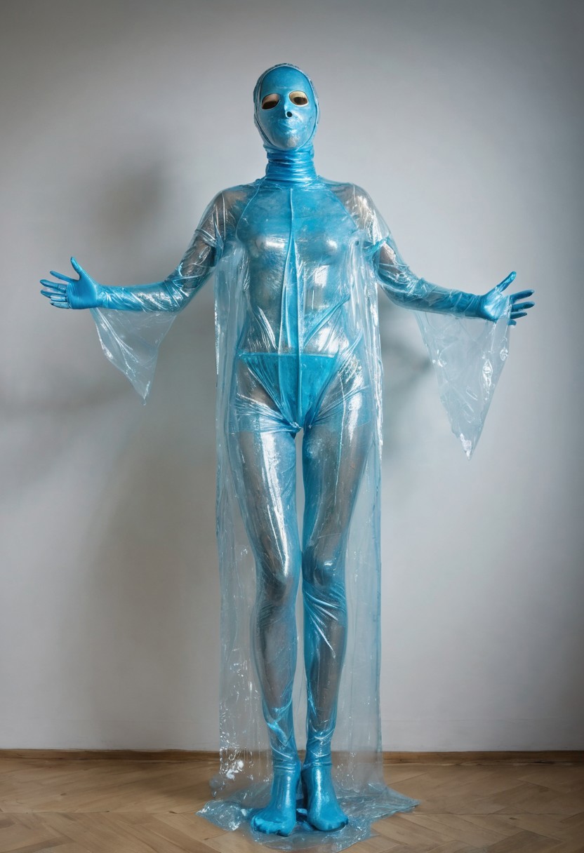 slim woman standing with legs spread wide completely encased In skintight light blue see through saran wrap , living statue, mummification, face encased in latex, skintight liquid latex mask, no wrinkles, no folds