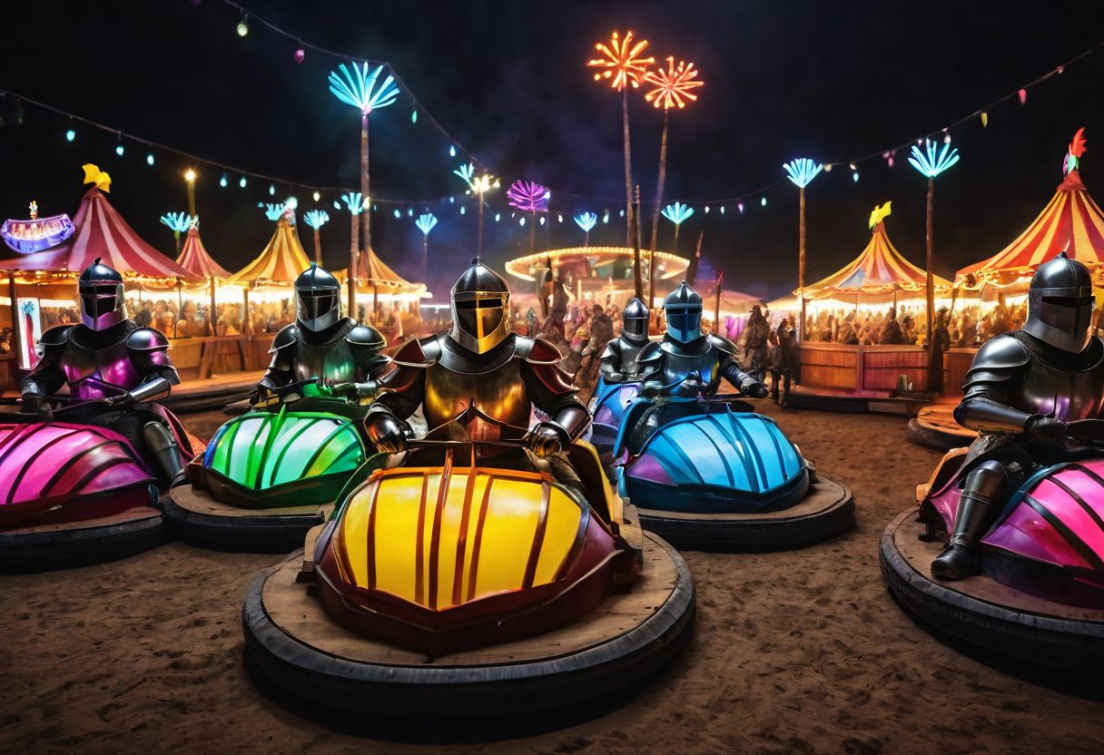 luminescent background, extravagant background, detailed background, scenery, decorated background, at the faire, bumper cars arena, knights in full plate armor, multicolored helmet plumes, knights fighting with swords, knights in bumper cars, hyperdetailed