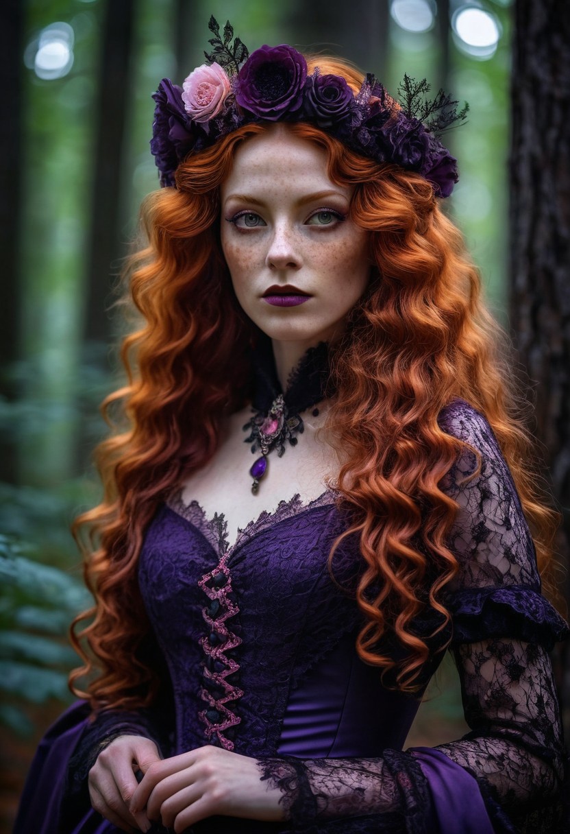 A captivating, cinematic photo of elegant beautiful woman age 42 with long curly orange hair and freckles transformed into a dark fantasy vampire goth queen. She is dressed in an exquisite, dark purple and pink Victorian dress adorned with intricate lace and patterns. Her long orange hair flows elegantly, and her eyes are a striking shade of purple. A matching purple headband enhances her look. The background is filled with a mystical, moonlit forest, creating an atmosphere of supernatural enchantment., dark fantasy, photo, cinematic