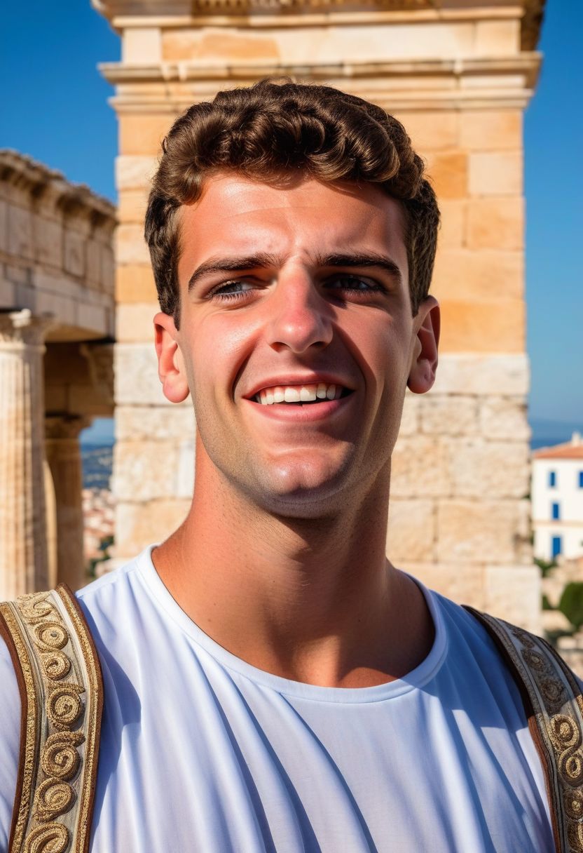 portrait of a 18 year old Roman boy, short height, wearing greek clothes, amused expression, greek architecture in the background