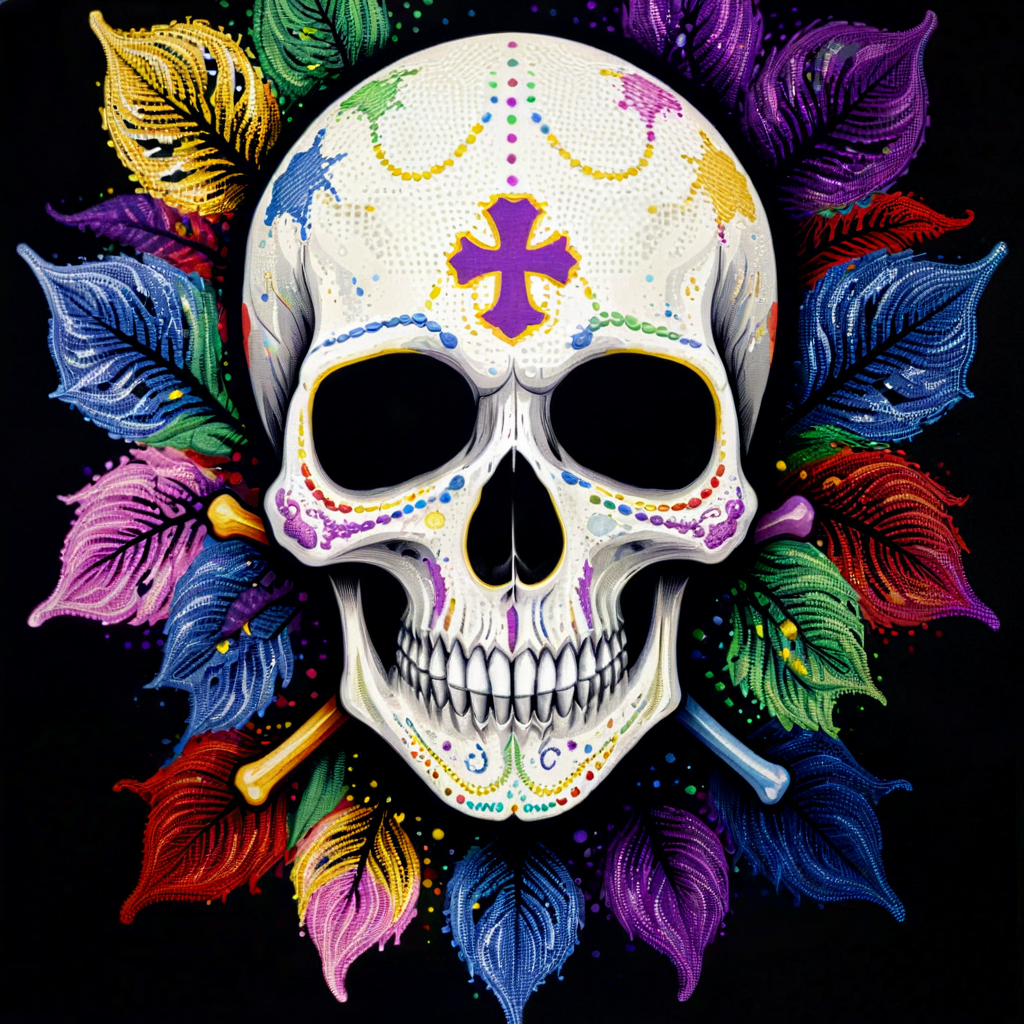 Pointillism style skull, bones, gothic, intricate details . Composed entirely of small, distinct dots of color, vibrant, highly detailed <lora:add-detail-xl:1> <lora:xl_more_art-full_v1:1>