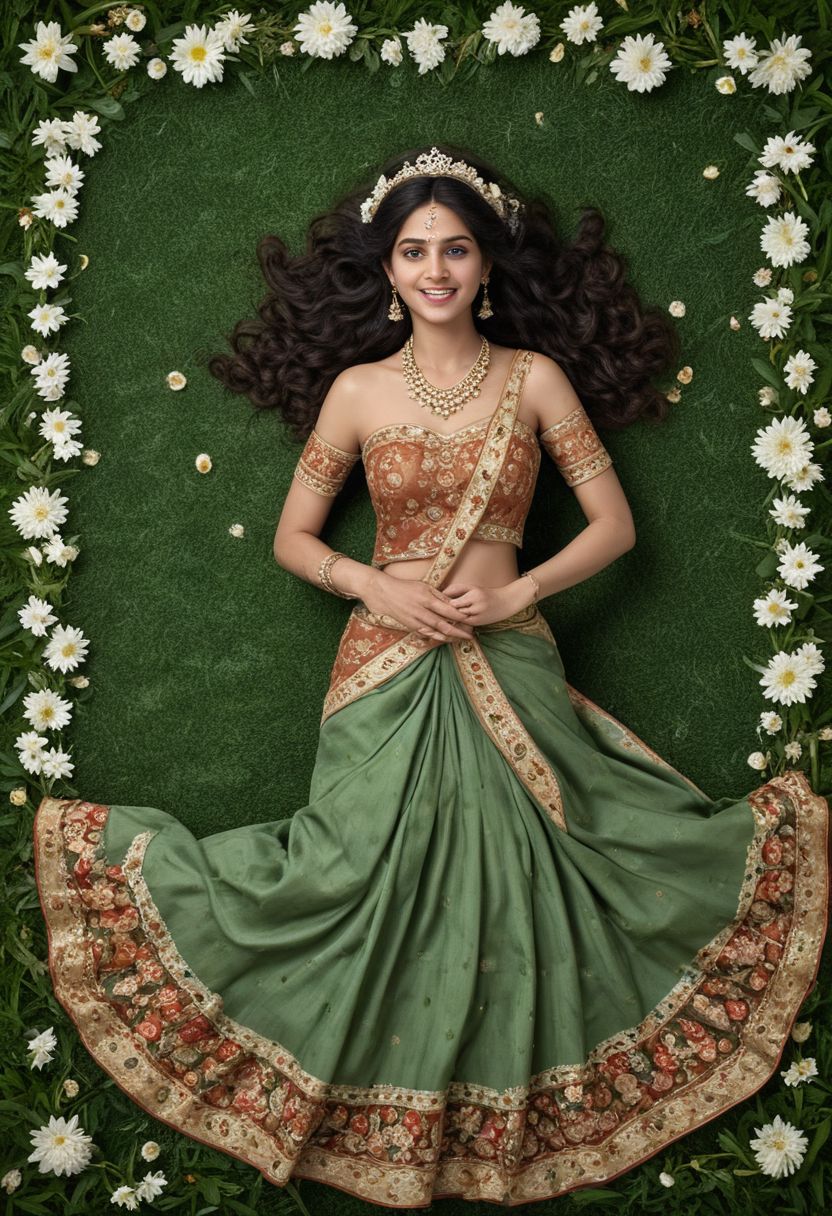 Craft a 3D image of an Indian queen, inspired by classical Indian art. Her long, curly hair flows elegantly, decorated with traditional, beautifully detailed flowers. She wears a green dhoti and a matching strapless blouse, with minimal yet culturally rich jewelry. The queen is lying on a verdant patch of grass, her navel in contact with the ground, her legs gracefully raised behind her. A gentle, enigmatic smile graces her face. The scene features a dark background illuminated by a radiant, full moon and an intricate floral design, reminiscent of classical Indian artistic motifs.