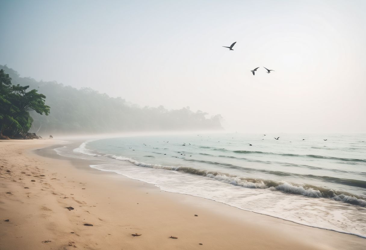 beautiful sea scene, a foggy beach somewhere in asia with birds in the sky, soft shadows, filmgrain