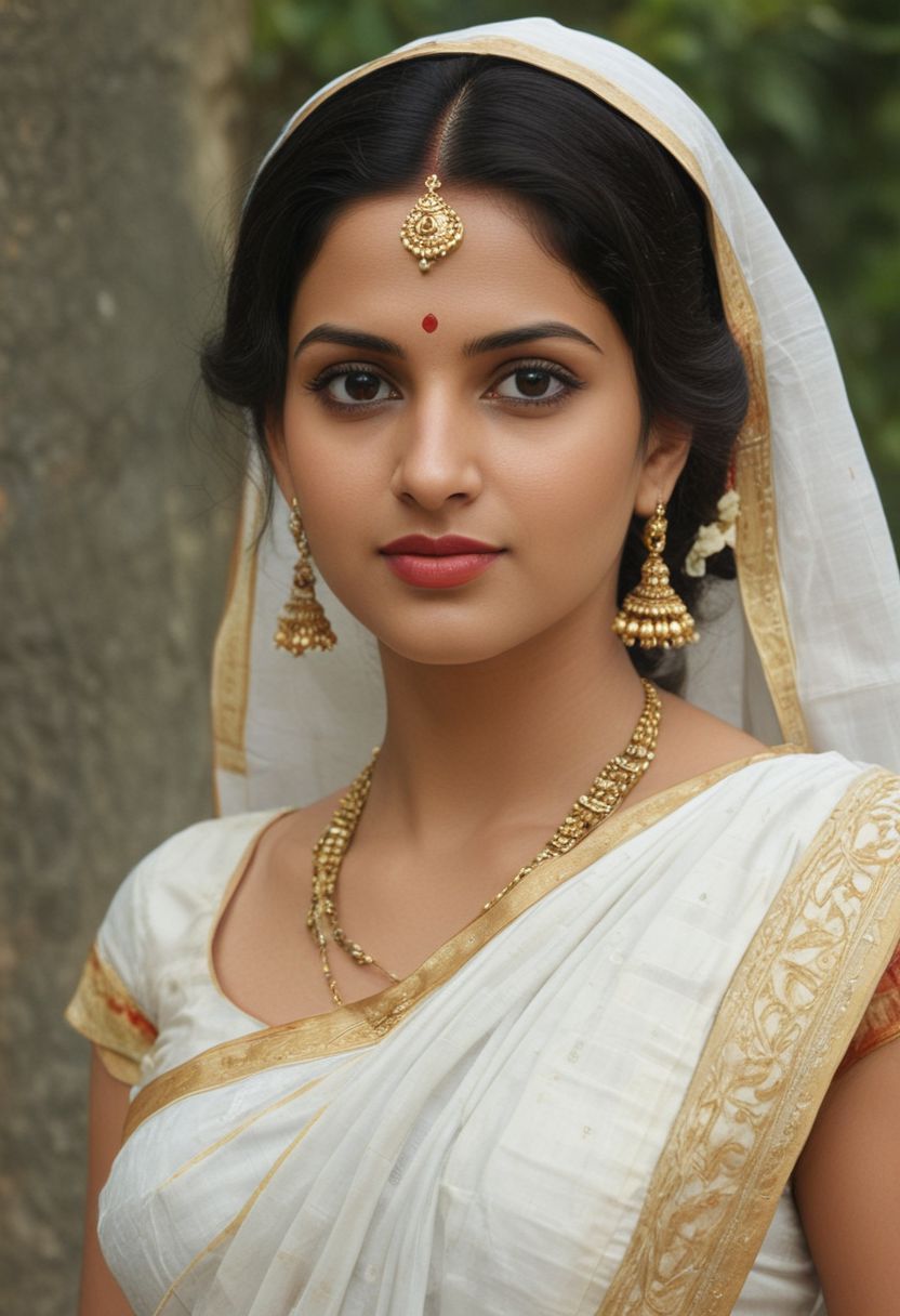 woman beautiful dark haired woman, kerala state white saree, tilak on head, lipstick colour will enhance the image