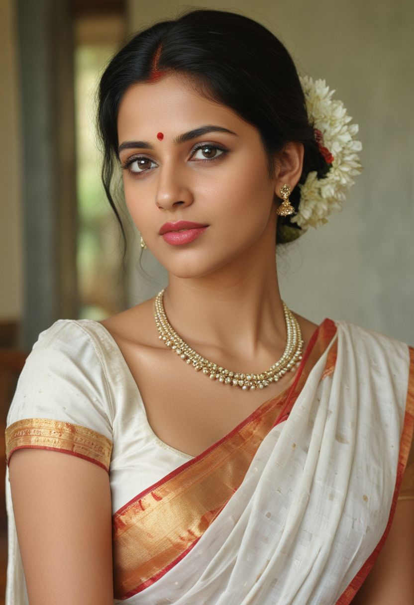 woman beautiful dark haired woman, kerala state white saree, tilak on head, lipstick colour will enhance the image