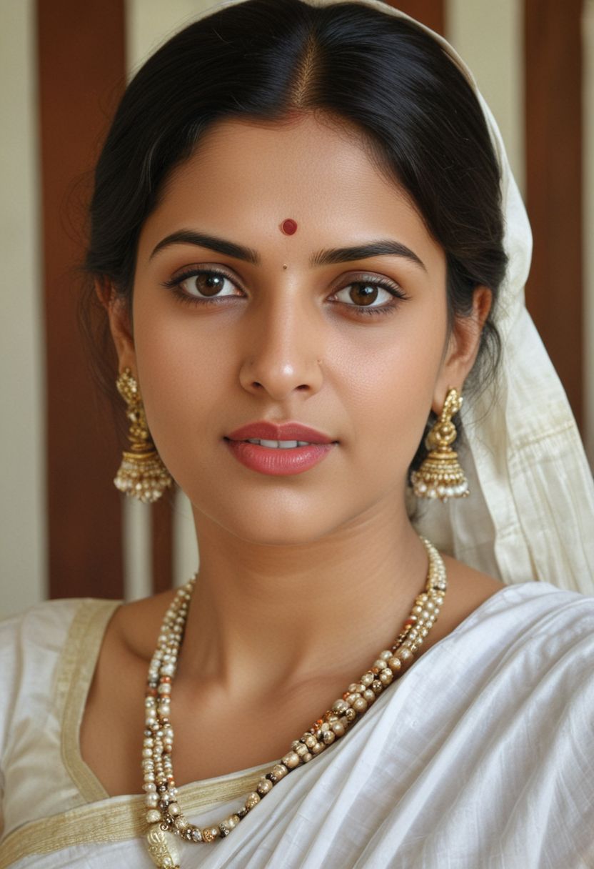 woman beautiful dark haired woman, kerala state white saree, tilak on head, lipstick colour will enhance the image