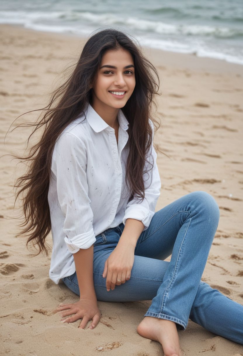 Beautiful Indian girl in a buttoned shirt with jeans with subtle smile sits causally on a sandy beach,with waves crashing her leg.ocean waves crashing against each other, creating white sea foam .Her long hair is windswept. Tilak on face, eyes with kazal