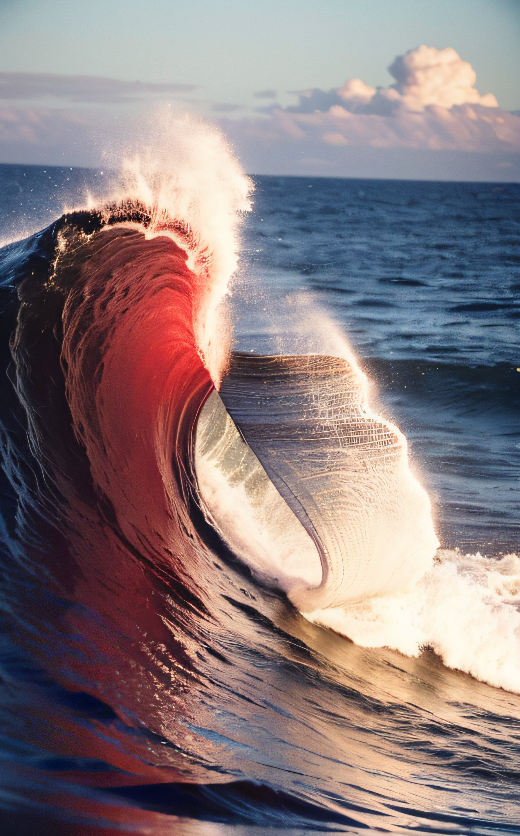 analog film photo red wave, The wave's crest extends slightly beyond a thick circle that has been painted over the wave. The fire circle was added to the image afterward, giving it a layered, dynamic effect. The circle and Wave shaping an Heart shaped/icon, The overall composition should be visually striking and artistic, with a focus on the interplay between the wave and the circle., Made of bold perfect lines, . faded film, desaturated, 35mm photo, grainy, vignette, vintage, Kodachrome, Lomography, stained, highly detailed, found footage