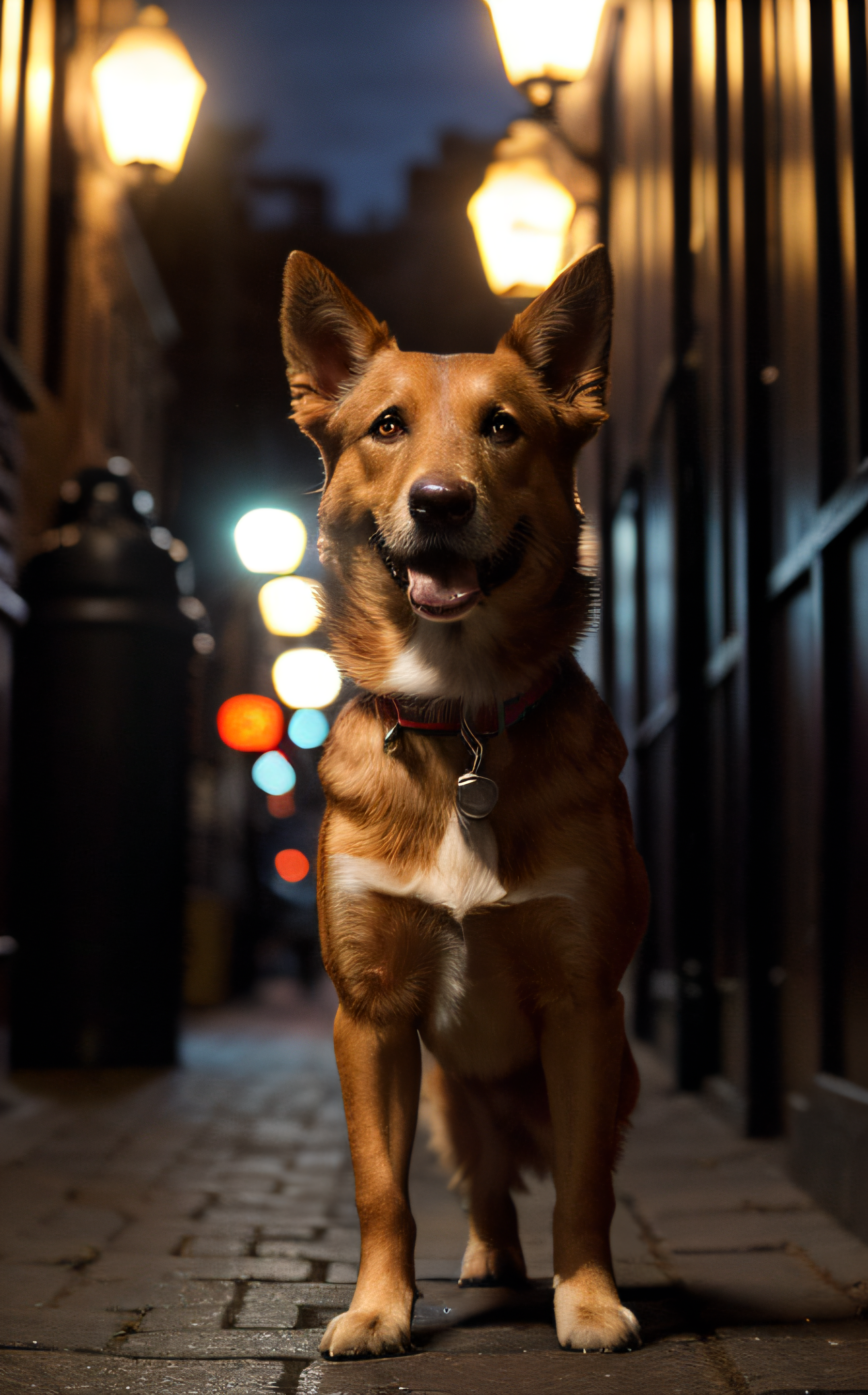 cinematic film still ((best quality)), ((masterpiece:1.2)), (detailed:1.2), A vibrant pop art rendition of a dog exploring an urban alley at night. Bold colors and strong contrasts highlight the dog's fur and the dramatic shadows cast by streetlights. The scene captures a sense of playful curiosity and adventure in the gritty cityscape, rendered in a dynamic and expressive pop art style. <lora:epi_noiseoffset2:1> . shallow depth of field, vignette, highly detailed, high budget, bokeh, cinemascope, moody, epic, gorgeous, film grain, grainy