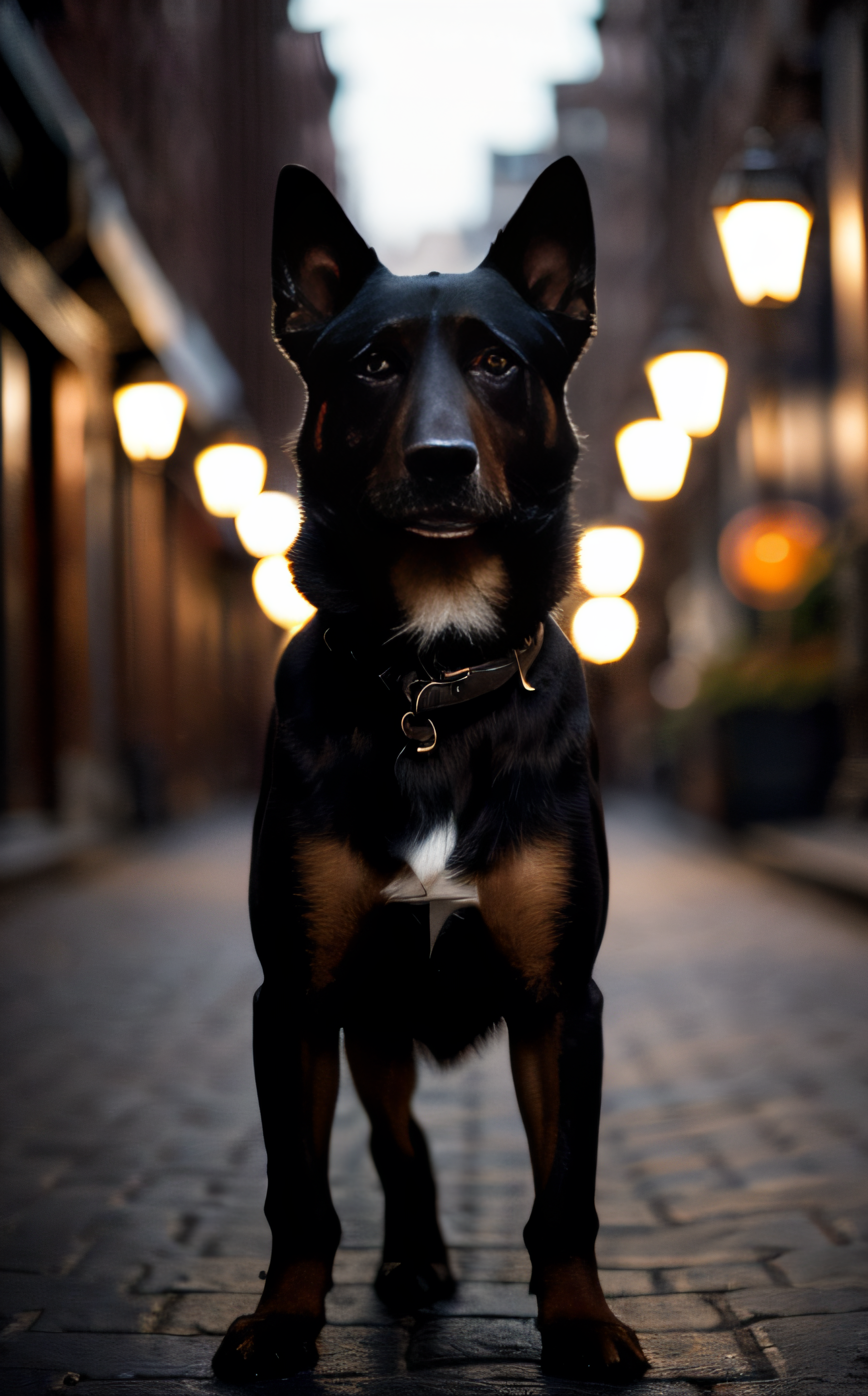 cinematic film still ((best quality)), ((masterpiece:1.2)), (detailed:1.2), A majestic dog explores an urban alley at night, illuminated by streetlights casting dramatic shadows. Its fur glistens under the glow, capturing a moment of curiosity and adventure in the gritty cityscape. <lora:epi_noiseoffset2:1> . shallow depth of field, vignette, highly detailed, high budget, bokeh, cinemascope, moody, epic, gorgeous, film grain, grainy