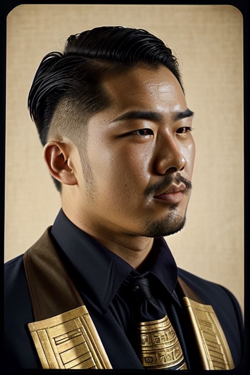 A portrait of an Asian man, short hair,undercut, 1920s, Taishō Roman, gentleman, suit and tie, masculine, manly, hunk, macho, yaro, stardom, beautiful, glamorous, (in the style of Takehisa Yumeji), art deco, retro, old fashioned, looking at viewer, eye contact, vibrant, vivid, (background of fabric with black&gold&tan art-deco abstract geometric flowers), old technicolor film style, film grain, aged film stock, insanely detailed, masterpiece, extraordinary achievement, award-winning