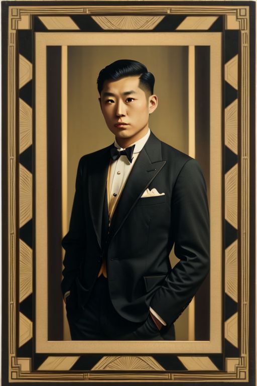 A portrait of an Asian man, short hair, undercut, 1920s, Shōwa era, gentleman, suit and tie, (masculine, manly, hunk, macho, goatee, yaro, handsome, charming, alluring), stardom, beautiful, glamorous, art deco, retro, old fashioned, looking at viewer, eye contact, vibrant, vivid, (background of fabric with black&gold&tan art-deco abstract geometric flowers), old technicolor film style, film grain, aged film stock, insanely detailed, masterpiece, extraordinary achievement, award-winning