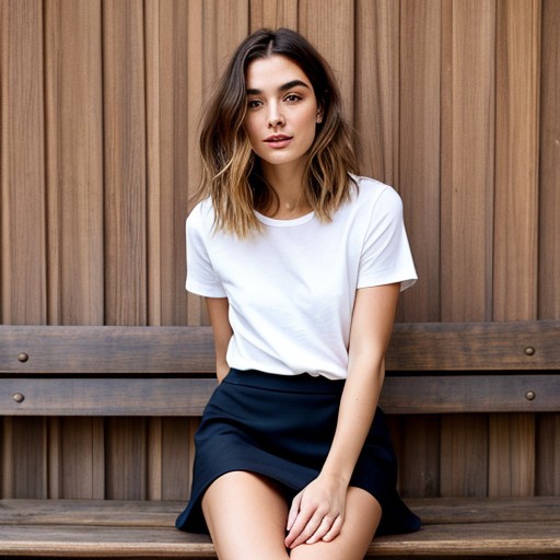 Captivating fashion portrait of a 25-year-old Italian model with long, straight brunette locks and alluring hazel eyes, seated on a rustic wooden bench in a casual yet chic ensemble - a crisp white t-shirt clinging to her curvaceous figure, a vibrant red mini skirt showcasing her toned legs, and stylish black boots adding an edgy touch, soft natural lighting accentuating her flawless complexion and high-cheekbones, a subtle smile hinting at an air of confidence and mystery, inspired by the effortless style of Italian fashion icons, high-resolution, elegant yet sultry.
