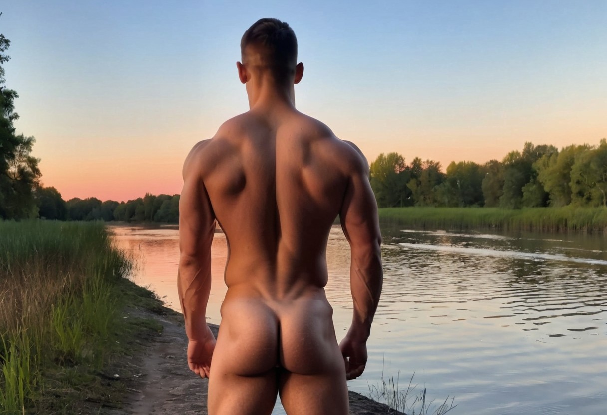 Absolutely naked Muscle boy with naked muscle butt on sunset river