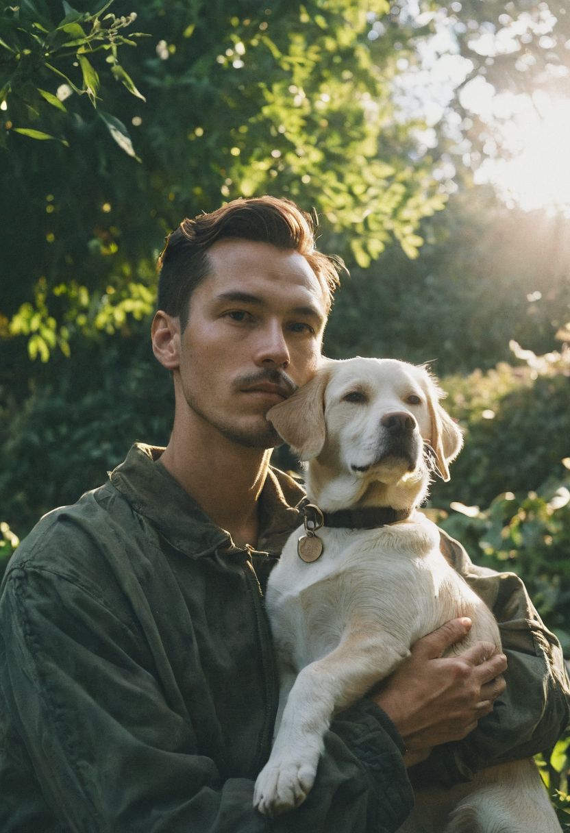cinematic film still fashion photography portrait of 1man with dog as companion, grainy, headshot, sunlight , Fine Art & Beauty Photography – ,,light diffraction in frame, dreamy,hazy look. Helios 44-2 lens mounted on a Praktica MTL 5B Helios 44M-4 lens, 58mm f/2, in a garden.