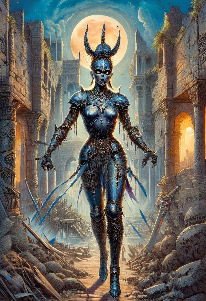 score_10, score_9, score_9_up, score_8_up, score_7_up, masterpiece, best quality, Fantasy, 1980s Fantasy Style, huge sword, female, dark skin, solo, middle-aged, mature woman, breastplate, detailed face, light armor, armor, greatsword, moonlight greatsword, holding sword, claymore, black hair, hair bun, grey eyes, loose strands, stern, dynamic pose, blue clothes, trousers, pants, boots, paladin, fighter, rogue, vivid color, coliseum, colosseum, gladiator arena, gladiator, Tower-of-Doom-Ludmille