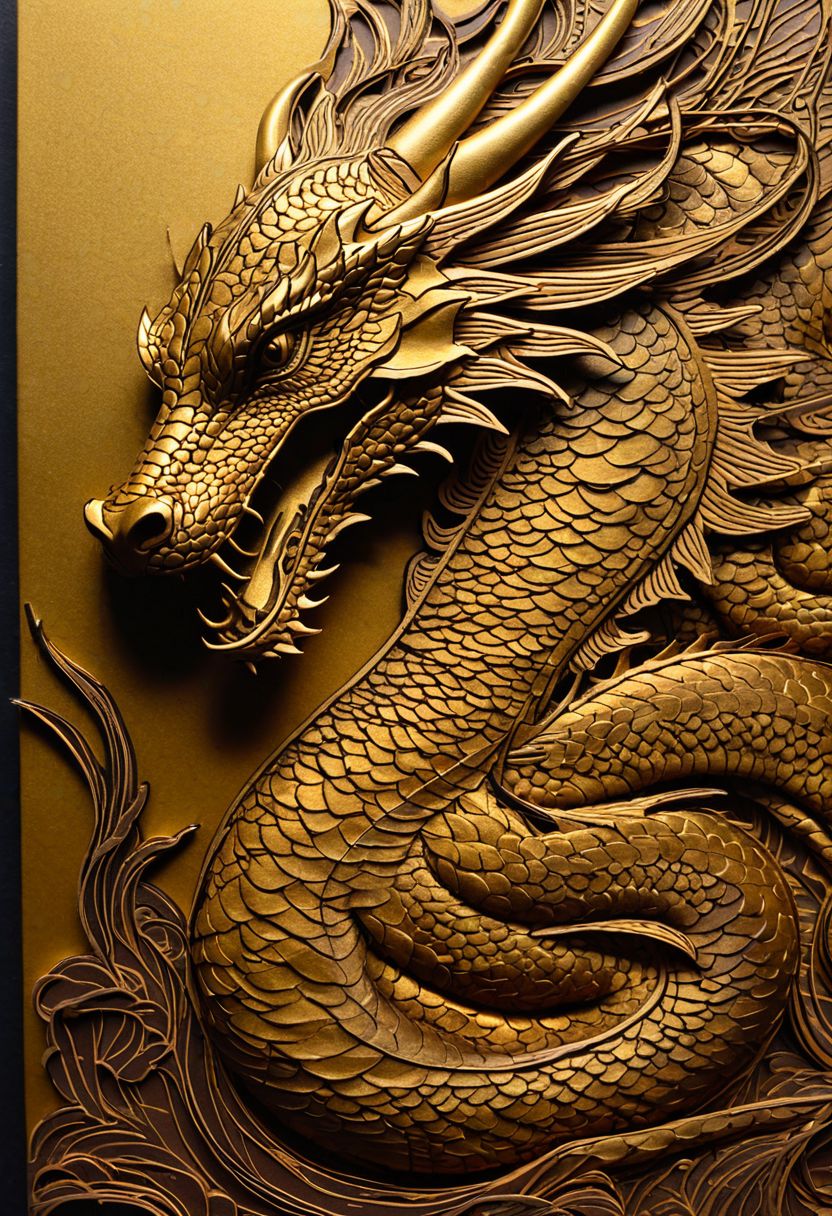 Thick layer, dark gold, bold lines, hyper detailed, a dark warm limited palette, chiaroscuro, linquivera, liiv1, Deep 3D, volumetric, dimensional, depth, thick paper, high stack, heavy texture, tangible layers, papercut art of linquivera kylin, dark dragon