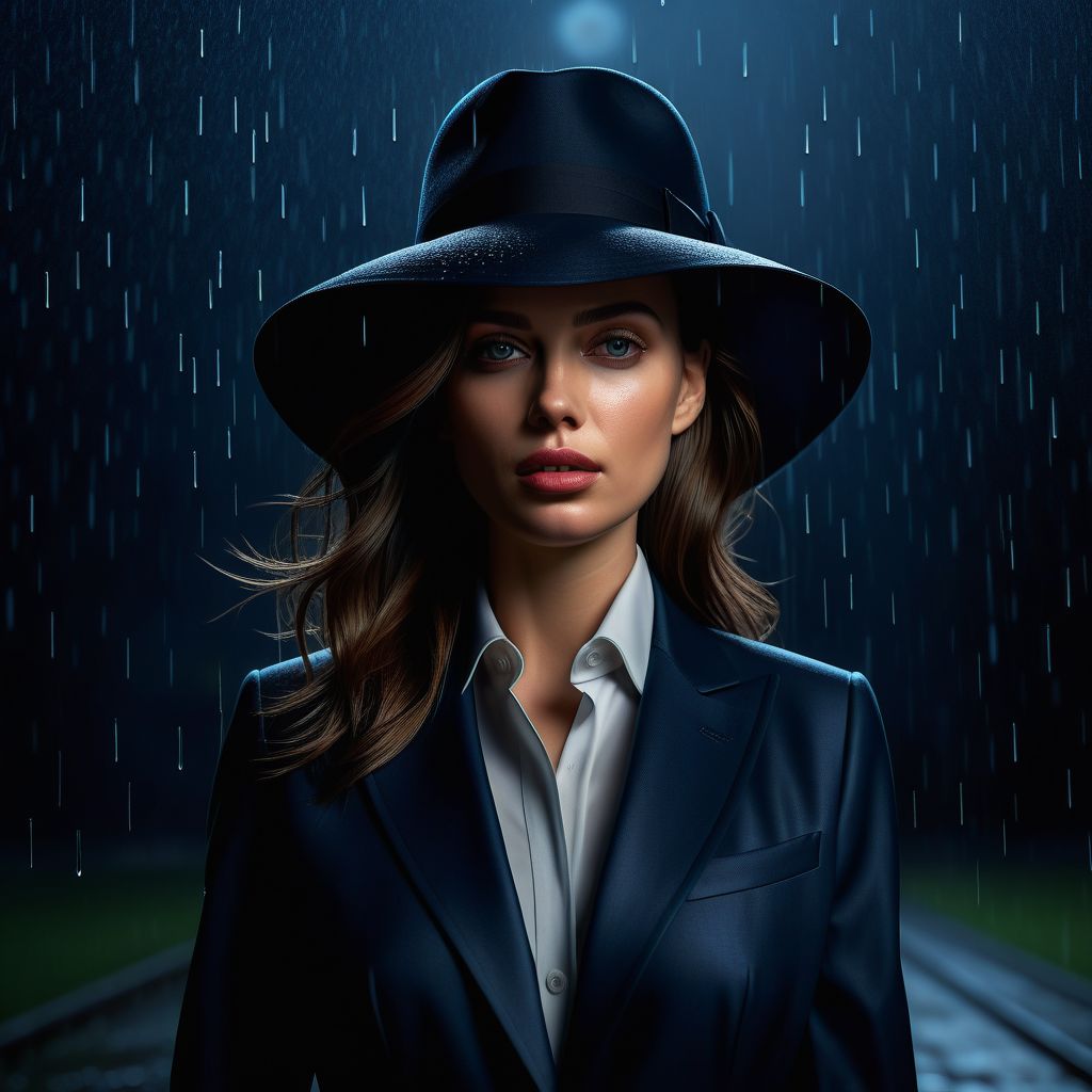 Ultra realistic color pencil image of a woman in a business suit with a wide brimmed hat, standing in a torrential rain. BREAK Deep dark intense midnight blue misty background, Dark theme, dynamic lighting, (soft shadows), (soft focus), (photo realistic), uhd, 8k