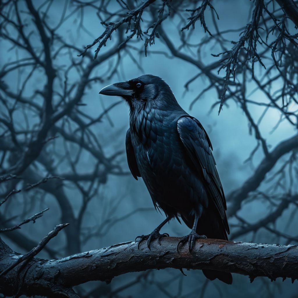 A raven sits on a branch of a tree. The raven is lean and intelligent. The surrounding world is post-apocalyptic. The tone of the light is cold and bluish. Rain with spooky scary dark in night, 8k, realistic, cinematic.