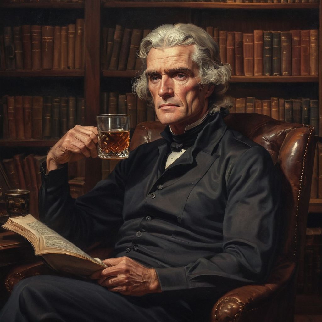 portrait of Thomas Jefferson wearing a black polo shirt, serious look, moody, highly detailed, sitting in an armchair drinking a glass of whiskey while reading a book. BREAK Deep dark intense brown misty background of a library with lots of books. Dark theme, dynamic lighting, (soft shadows), (soft focus), (photo realistic), uhd, 8k