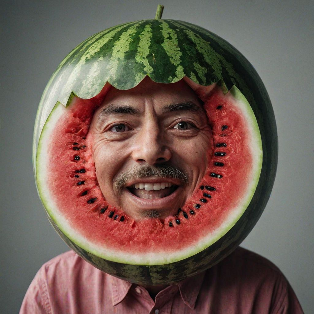 A portrait of a anthropomorphic watermelon for a magazine, (sharp focus), unrealism, CtFruitsRedmAF, (detailed facial features:0.4), high quality, professional photo, 28mm, (intricate detail), realistic, minimalism, Surreal Harmony, cinematic, lighting, 8K, HDR10, analog, shot on large format, AnalogRedmAF, fujifilm, arri alexa, masterpiece, extremely detailed.