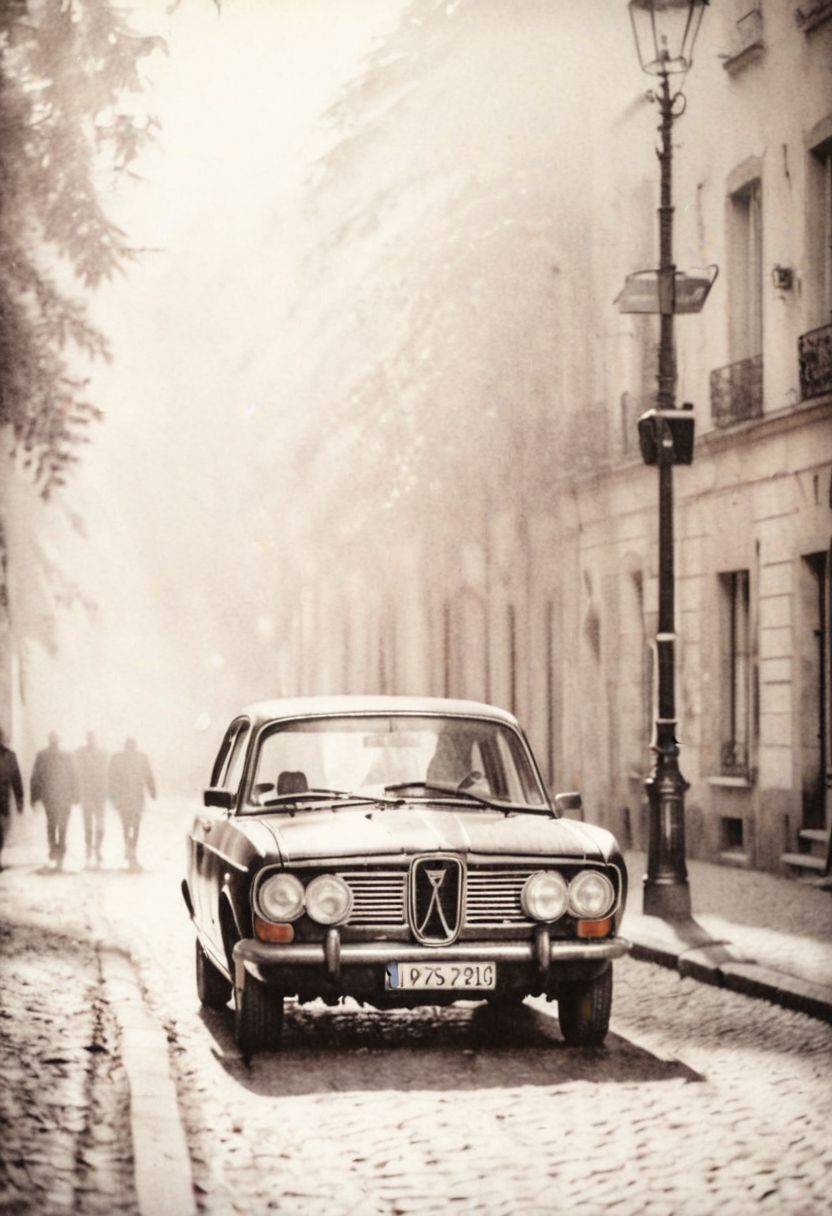 lith_argenta_pressPH1, instagram photo,an old car in a foggy street somewhere in a small european city, dark at night, hard shadows, film grain
