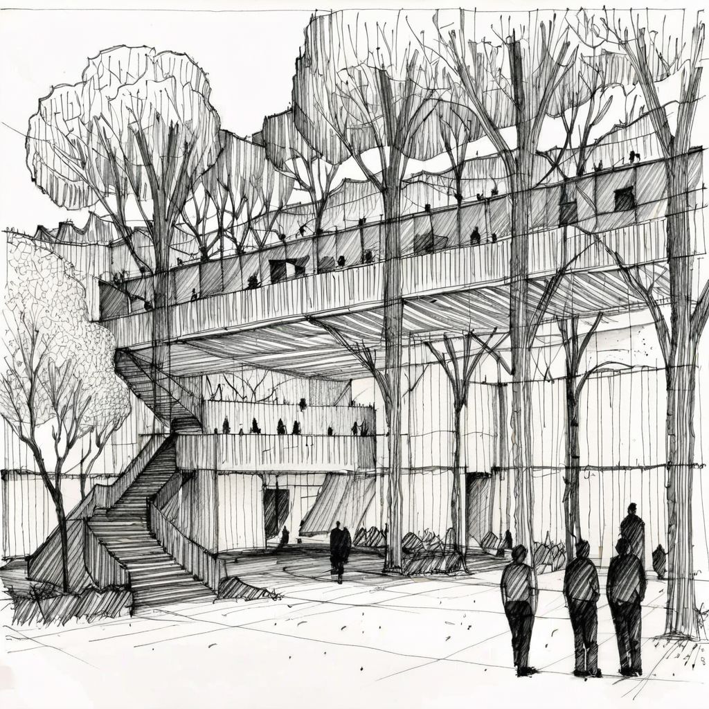 Architecture sketch, an old manhattan apartment, heavy black lines on white paper, trees, two people enjoying, <lora:HandSketcher-XL:0.7> <lora:xl_more_art-full_v1:0.5>