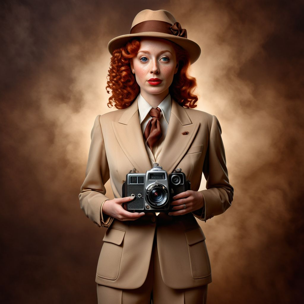 Ultra realistic full body color pencil drawing of curly red haired beautiful 1940s female press photographer, in a beige business suit and a borsalino hat. Holding an Mamiya 645 film camera in her hands. BREAK Deep dark intense brown foggy background, dynamic lighting, (soft shadows), (soft focus), (photo realistic), uhd, 8k